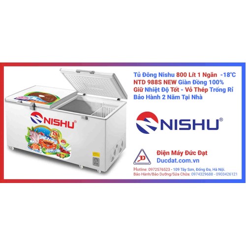 Tủ đông Nishu NTD-988S-New là dòng tủ đông cao cấp, được thiết kế trên dây chuyền công nghệ Nhật Bản mới nhất. Tủ sử dụng dàn lạnh bằng đồng 100%, lòng phẳng chống dính tốt giúp tủ làm lạnh cực nhanh, giữ lạnh tốt, tiết kiệm điện năng. Tủ có dung tích rất lớn giúp bảo quản tốt nhiều loại thực phẩm khác nhau như: kem, thực phẩm đông lạnh, phù hợp sử dụng trong các nhà hàng, đại lý, siêu thị lớn…